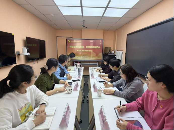 为深入推进党建与业务工作深度融合,实现双融双促,切实破解教学管理中的痛点难点,提升基层治理效能,3月19日下午,基层两委教育学院教工党支部与教务处党支部联合开展“党建联学联建”主题党日活动,扎实推进“双带头人”教师党支部书记工作室建设。 活动伊始,基层两委教育学院教工党支部书记亓金锋带领全体党员开展“第一议题”学习,深入学习领会“一步一步”的方法论和政绩观。 教务处党支部书记邹燕对基层两委教育学院长期以来的支持表示感谢。她表示,此次联合学习是党建工作的一次创新实践,为双方搭建了优质的交流互动平台,充分发挥党建引领作用,推动双方业务优势互补融合,既是一次主题党日活动,也是一次深入的调研实践。双方围绕教学管理、工作量计算等内容开展座谈交流,就工作量核算口径不统一、教学过程管控不够精细等问题进行深入研讨。 基层两委教育学院党总支副书记、院长邹建梅表示,本次活动进一步激发了双方互学共建的热情,深化了交流合作,为党建引领下业务深度融合发展奠定了坚实基础。希望双方常态化开展党建联学共建,持续提升教师队伍的教学能力与管理服务水平,实现优势互补、资源共享的良好合作局面。 大家一致认为,本次联学联建活动既强化了党员的理论武装,也将党建成果有效转化为解决实际问题的具体举措,为教学管理工作高质量发展注入了新动能。 教务处党支部书记、基层两委教育学院教工党支部书记和相关党员参加活动。